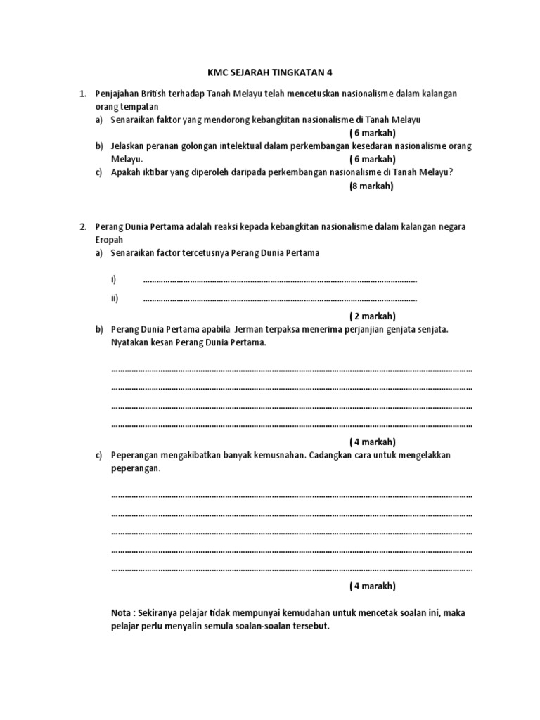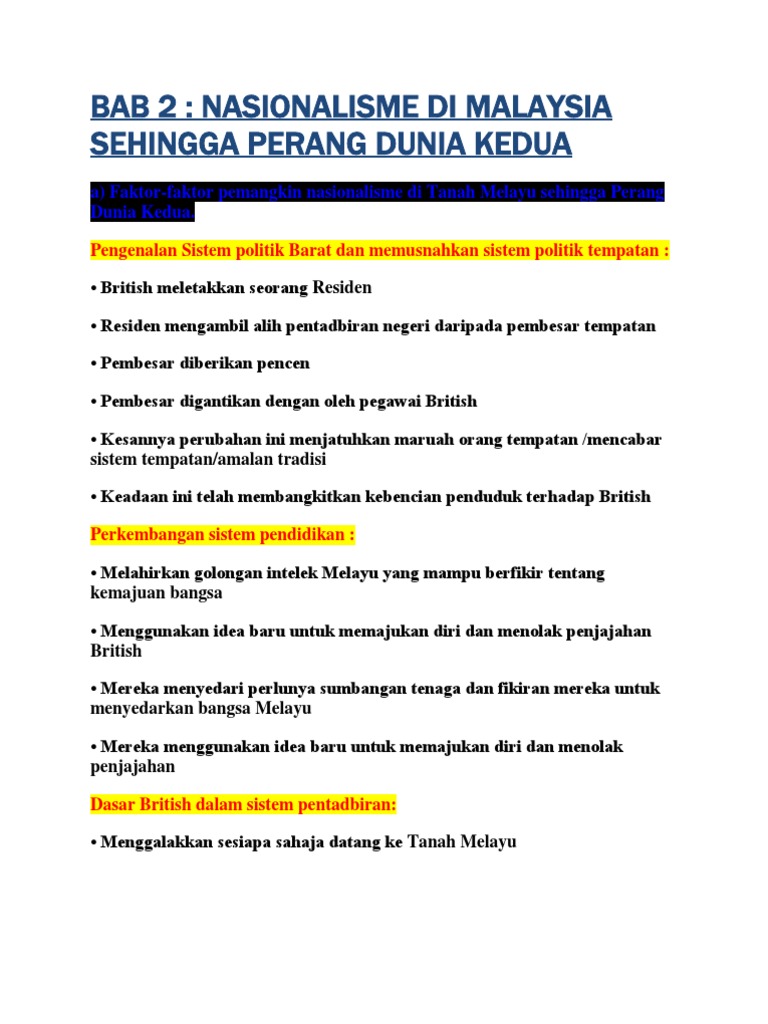 Hasil karya dari indonesia menjadi bahan bacaan masyarakat melayu (idea kebebasan politik dan penentangan terhadap. Nasionalisme itu sebenarnya telah wujud sebelum kedatangan british lagi, yang membezakannya adalah situasi penduduk di tanah melayu pada ketika itu yang tidak berada dalam bentuk seperti sekarang (disatukan di bawah satu pemerintahan). Namun, semangat kebangsaan atau nasionalisme mula tumbuh dan membenih di sitc. Kesedaran nasionalisme melayu moden di tanah melayu mempunyai hubungan yang rapat dengan gerakan pembaharuan ataupun islah islam yang sedang berkembang di asia barat pada masa itu. Perkembangan pendidikan di tanah melayu telah melahirkan satu golongan intelektual terpelajar. Faktor pelbagai bangsa, agama, dan adat resam menyebabkan proses pembentukan dan penyatuan kesedaran politik lambat berlaku. Golongan nasionalis di tanah melayu menggunakan bahasa dan kesusasteraan seperti cerpen, novel, puisi dan syair untuk memperjuangkan nasib orang melayu selain dijadikan hiburan. 7 nasionalisme melayu menurut musa hitam (1986): • kemasukan orang indonesia ke tanah melayu memudahkan penerimaan unsur kegiatan nasionalisme indonesia di tanah melayu. Menjadi pemangkin terhadap gerakan nasionalisme di tanah melayu. Polemik tersebut secara langsung mengembangkan idea nasionalisme dan menyuburkan gerakan antipenjajahan di tanah melayu. Semoga perkongsian nota sejarah tingkatan 5 bab 2 nasionalisme di malaysia sehingga perang dunia kedua dapat membantu pe;ajar dalam membuat. Oleh dr muhaimin sulam / march 10, 2021 march 10, 2021.