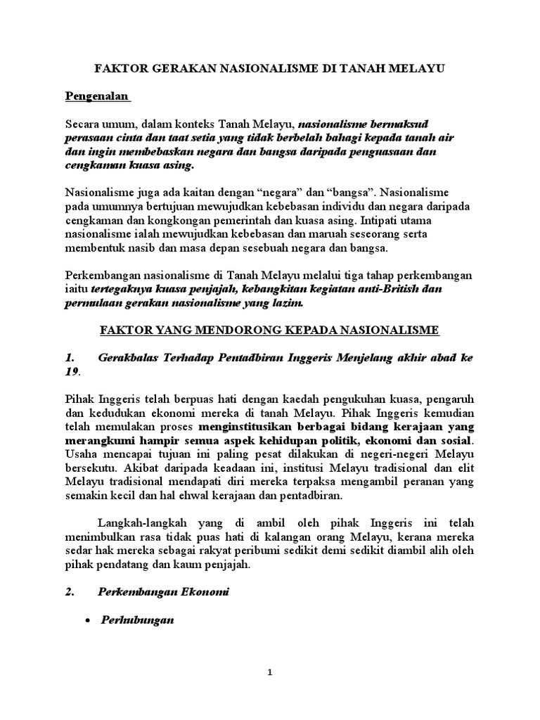 Kandungan 1.0 latar belakang nasionalisme di tanah melayu 2.0 nasionalisme melayu 3.0 nasionalisme cina 4.0 nasionalisme india 5.0 rumusan. Nasionalisme itu sebenarnya telah wujud sebelum kedatangan british lagi, yang membezakannya adalah situasi penduduk di tanah melayu pada ketika itu yang tidak berada dalam bentuk seperti sekarang (disatukan di bawah satu pemerintahan). Ini kerana residen telah menggantikan pembesar tradisional. Hasil karya dari indonesia menjadi bahan bacaan masyarakat melayu (idea kebebasan politik dan penentangan terhadap. Kemasukan orang indonesia ke tanah melayu memudahkan penerimaan unsur kegiatan nasionalisme indonesia di tanah melayu.