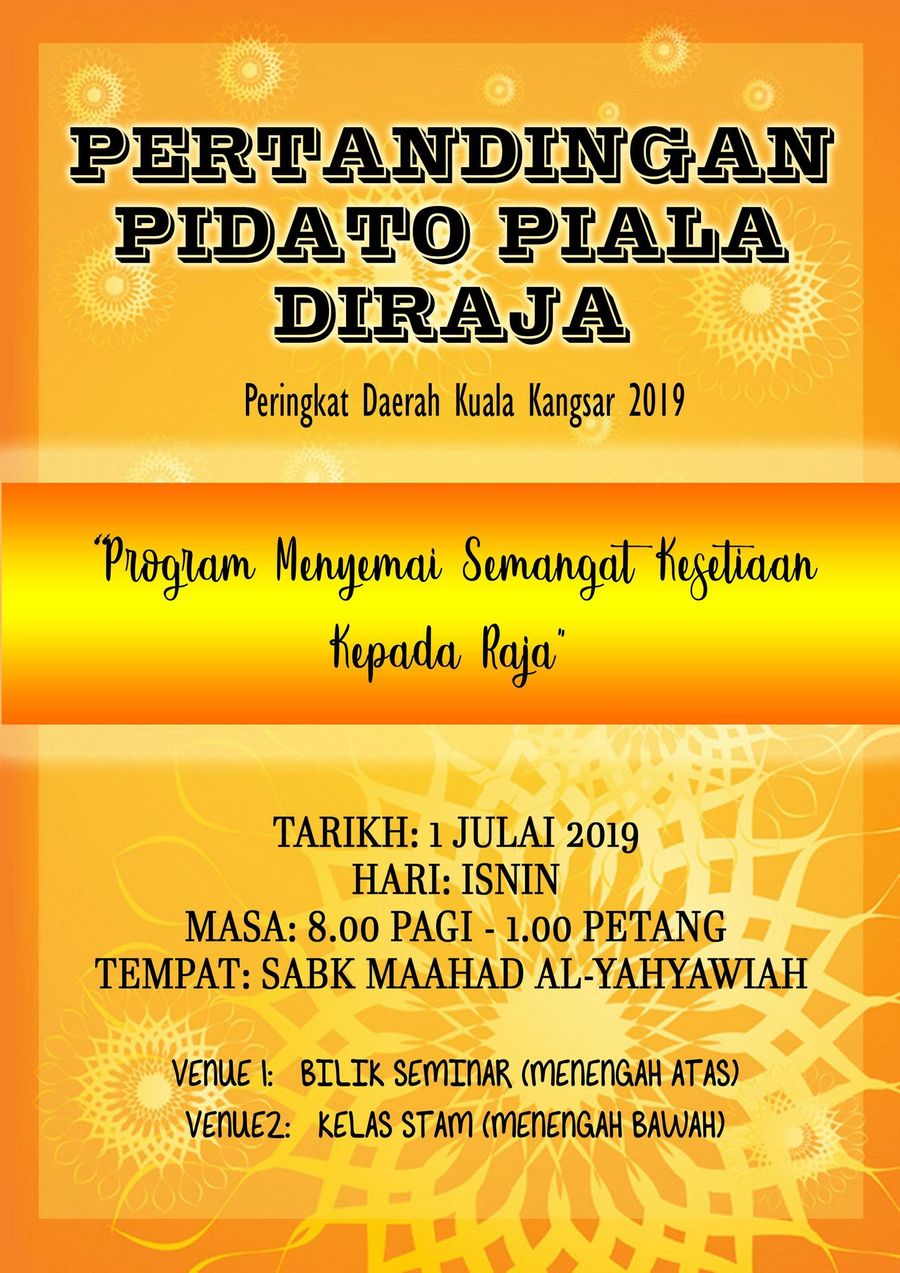 Sekolah tuanku abdul rahman , ipoh telah menghantar seorang wakil yang pelajar tingkatan 4 yang merupakan ahli hexa family iaitu nama pasukan bahas bahasa melayu sekolah untuk pertandingan pidato piala diraja peringkat kinta utara. Pertandingan pidato piala diraja daerah petaling perdana peringkat zon shah alam (a) tarikh 22 mac 2011 hari selasa masa 8.00 pagi 2.00 petang tempat smk alam Pertandingan pidato piala diraja peringkat bahagian samarahan 2012. Teks pidato bahasa melayu sekolah menengah ringkas. Yang disiarkan secara dari lapangan sdit cahaya sunnah, komplek rodja, kp.